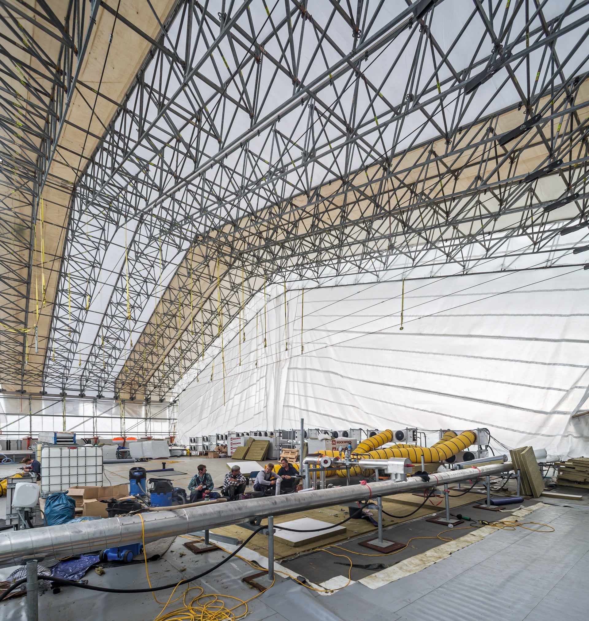 Der Aufbau des Daches in einzelnen verschiebbaren Binderpaaren erlaubt das einfache Öffnen des Daches z.B. für Materiallieferungen. -