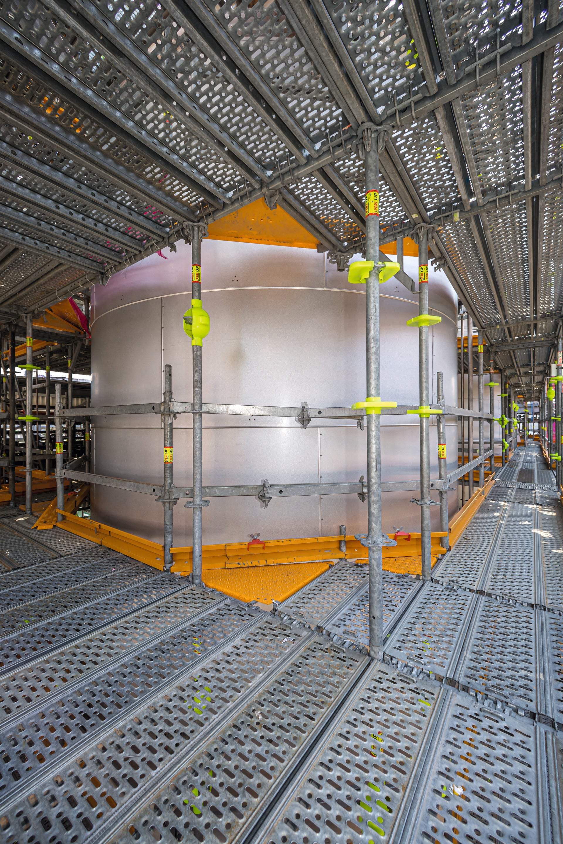 Stolperfreie Eckausbildungen und Übergänge mit PERI UP Systembauteilen sorgen für eine sichere Gerüstnutzung. Schutzkappen in Signalfarbe ergänzen das Sicherheitskonzept. -