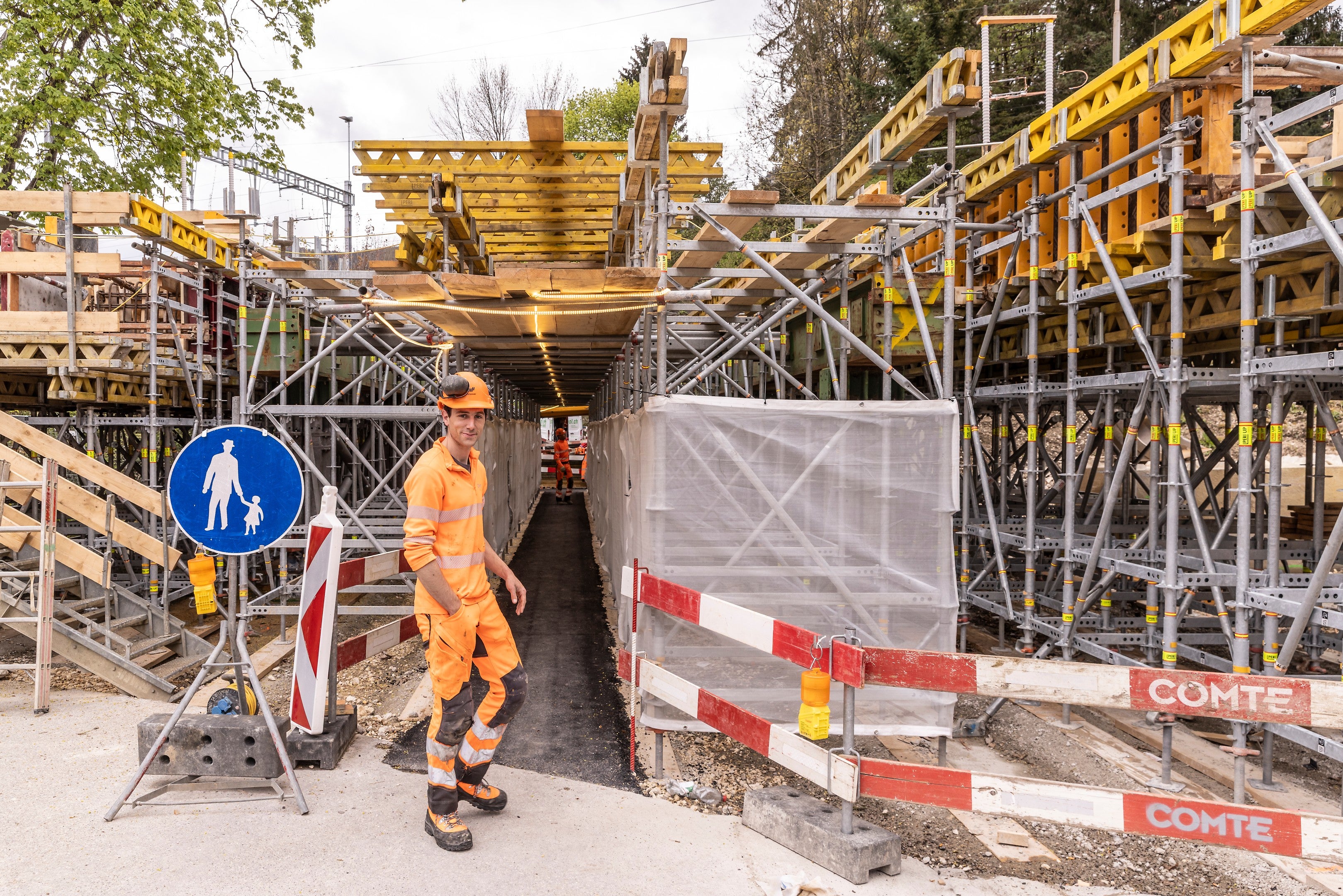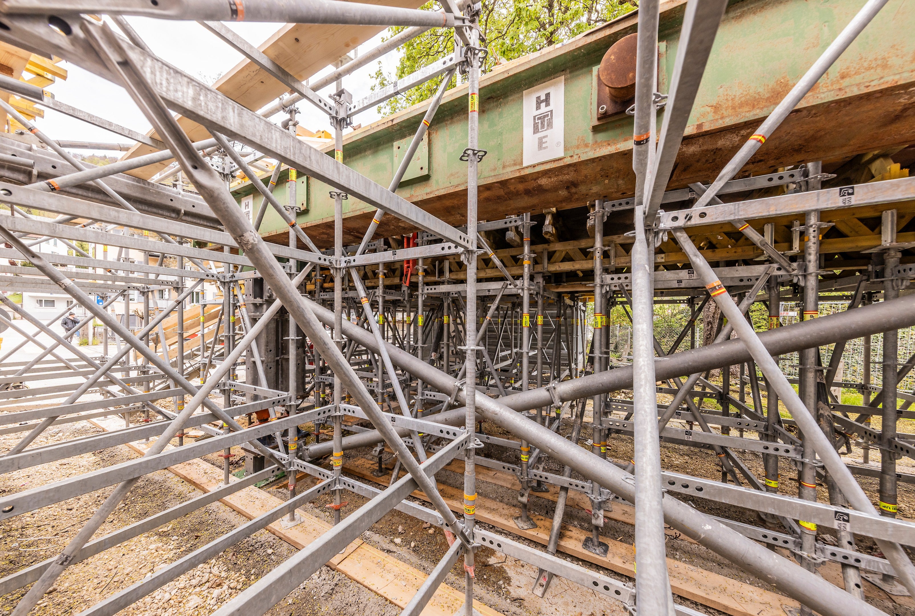 Zum Einsatz kamen durch G. Comte SA PERI UP Flex Stütztürme als tragende Lösung für das Brückenprovisorium.