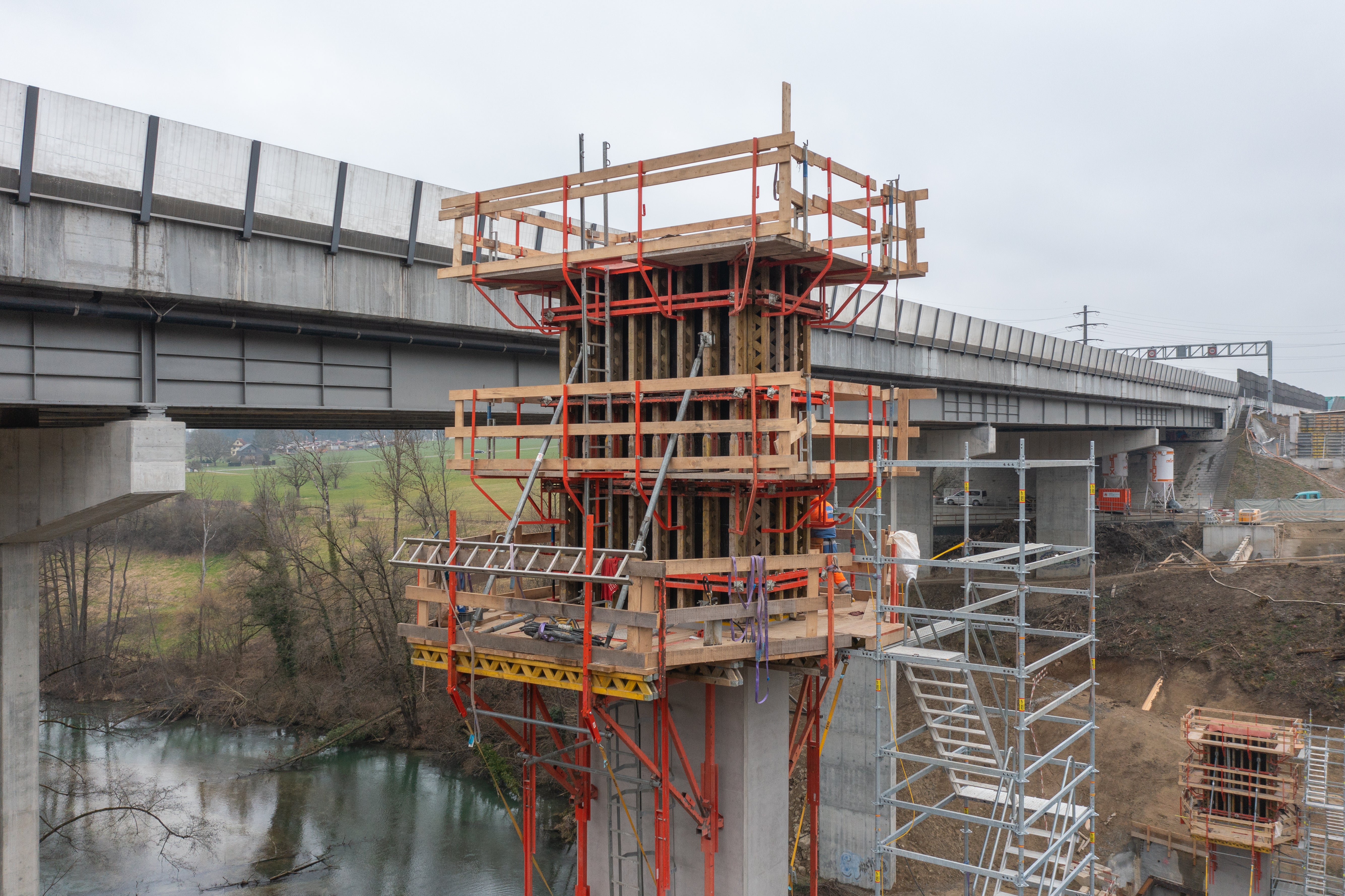 Die Brückenpfeiler werden in einer Kombination von CB 240 Kletterkonsolen, der VARIO GT24 Schalung, PERI UP Flex Treppentürmen und PERI UP Flex Bewehrungsgerüst erstellt.Sichtbetonanforderung Pfeilerschalung: