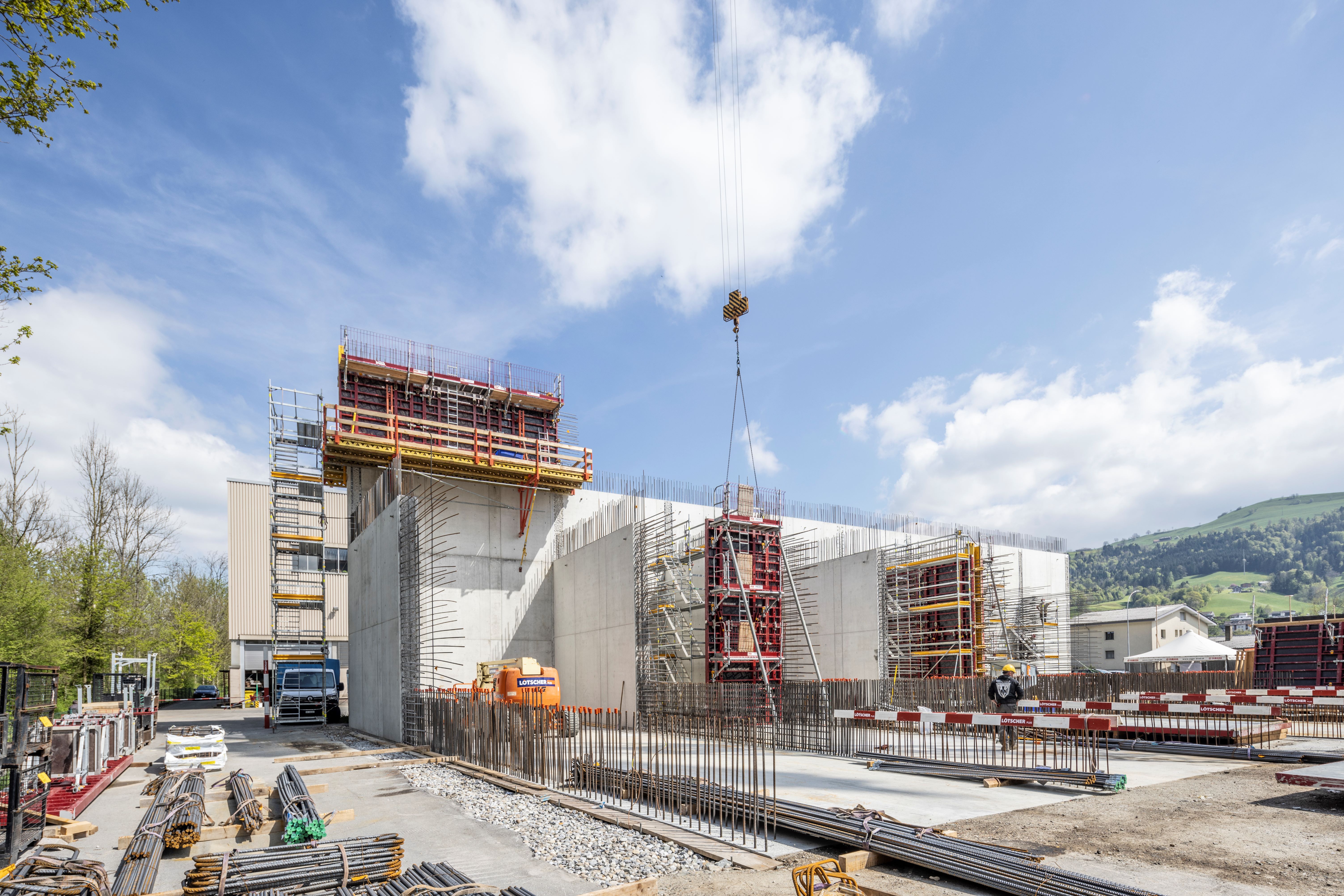 Nach der Erstellung der Bodenplatte wurden die untersten Wandetappen mit einer Höhe von 6,5 m mit der MAXIMO MX18 Wandschalung und dem MXK Konsolensystem erstellt.