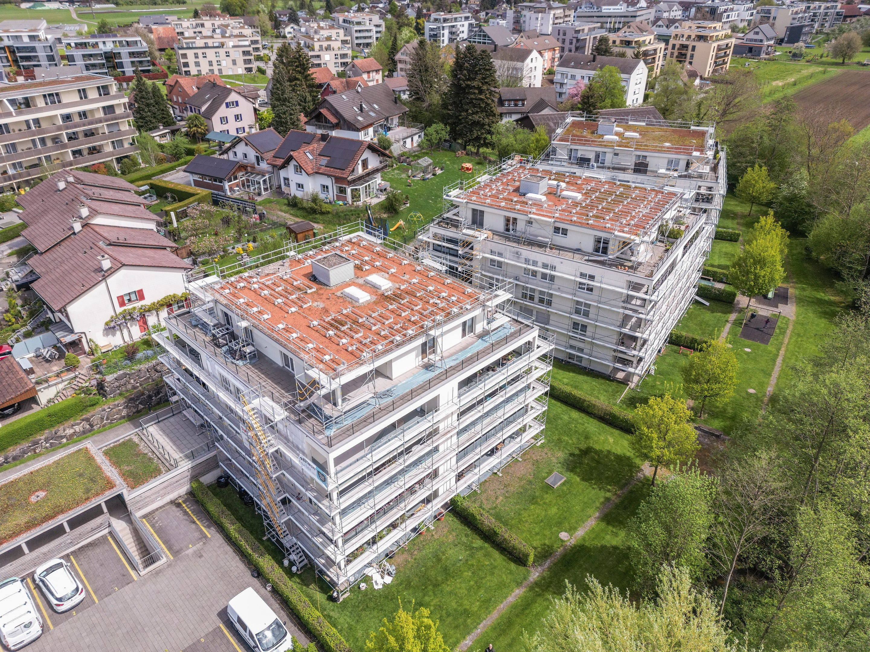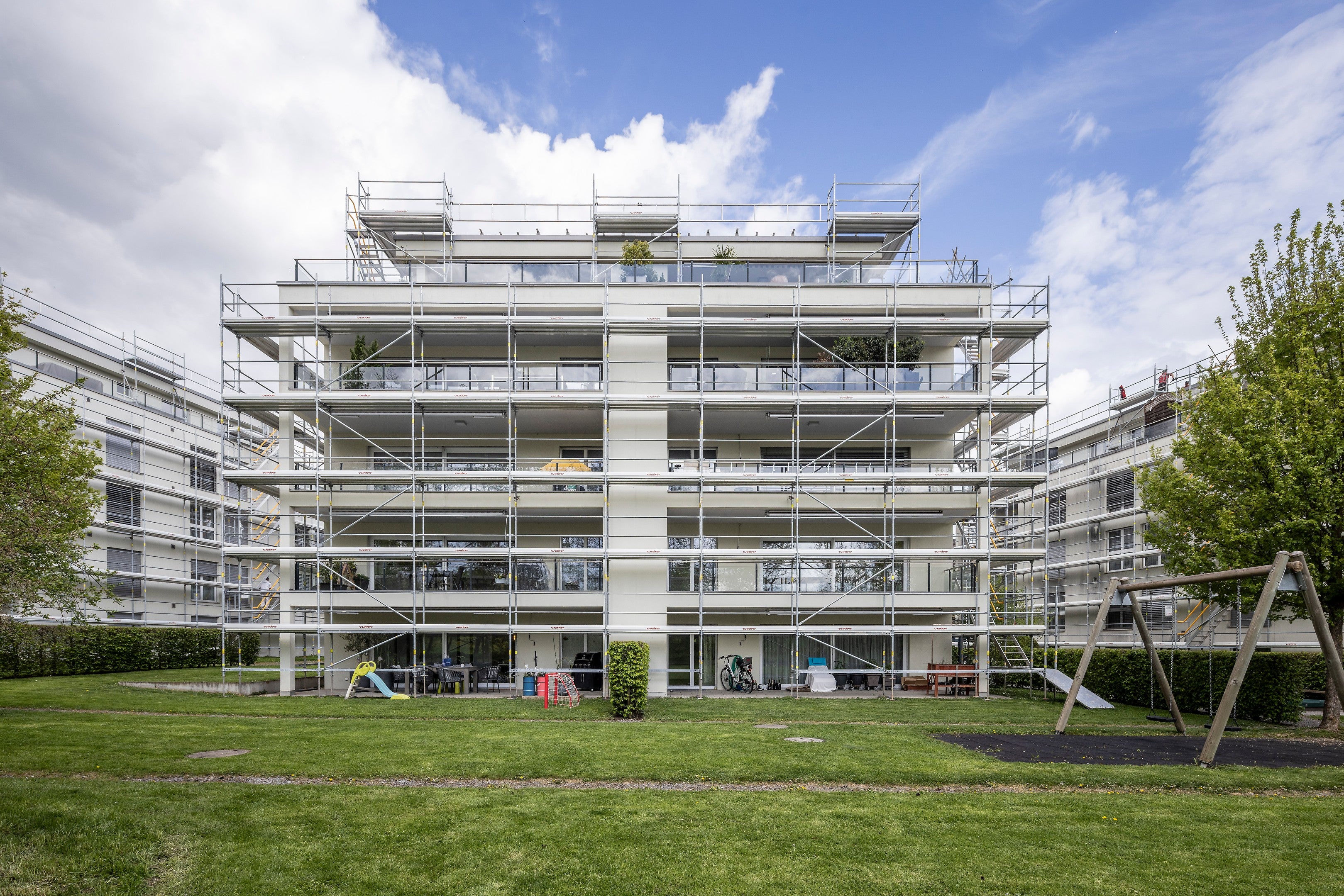Fassadensanierung mit PERI UP Easy Stiel und Dachrandgeländer bei 3 Mehrfamilienhäuser in Amriswil.