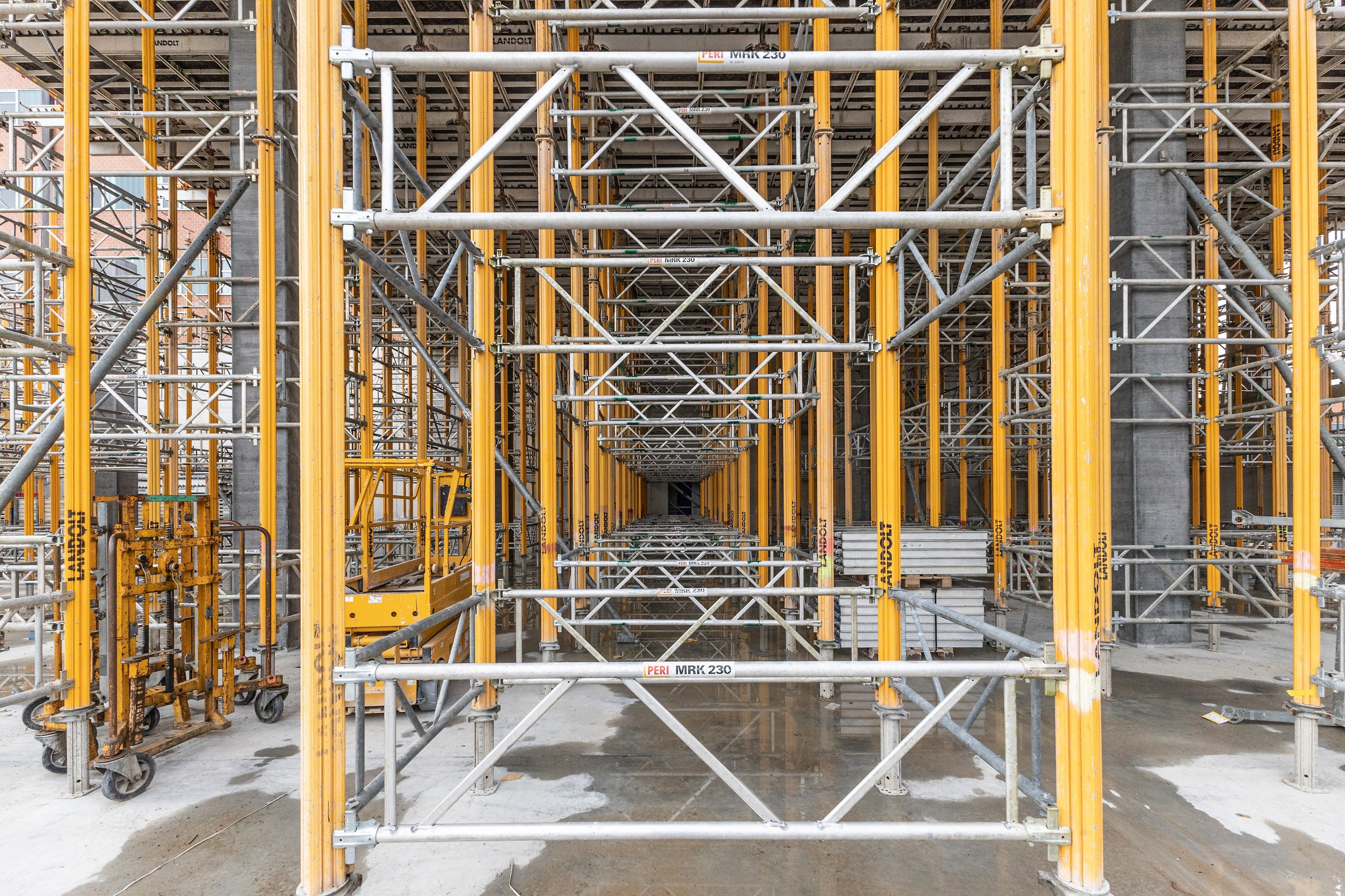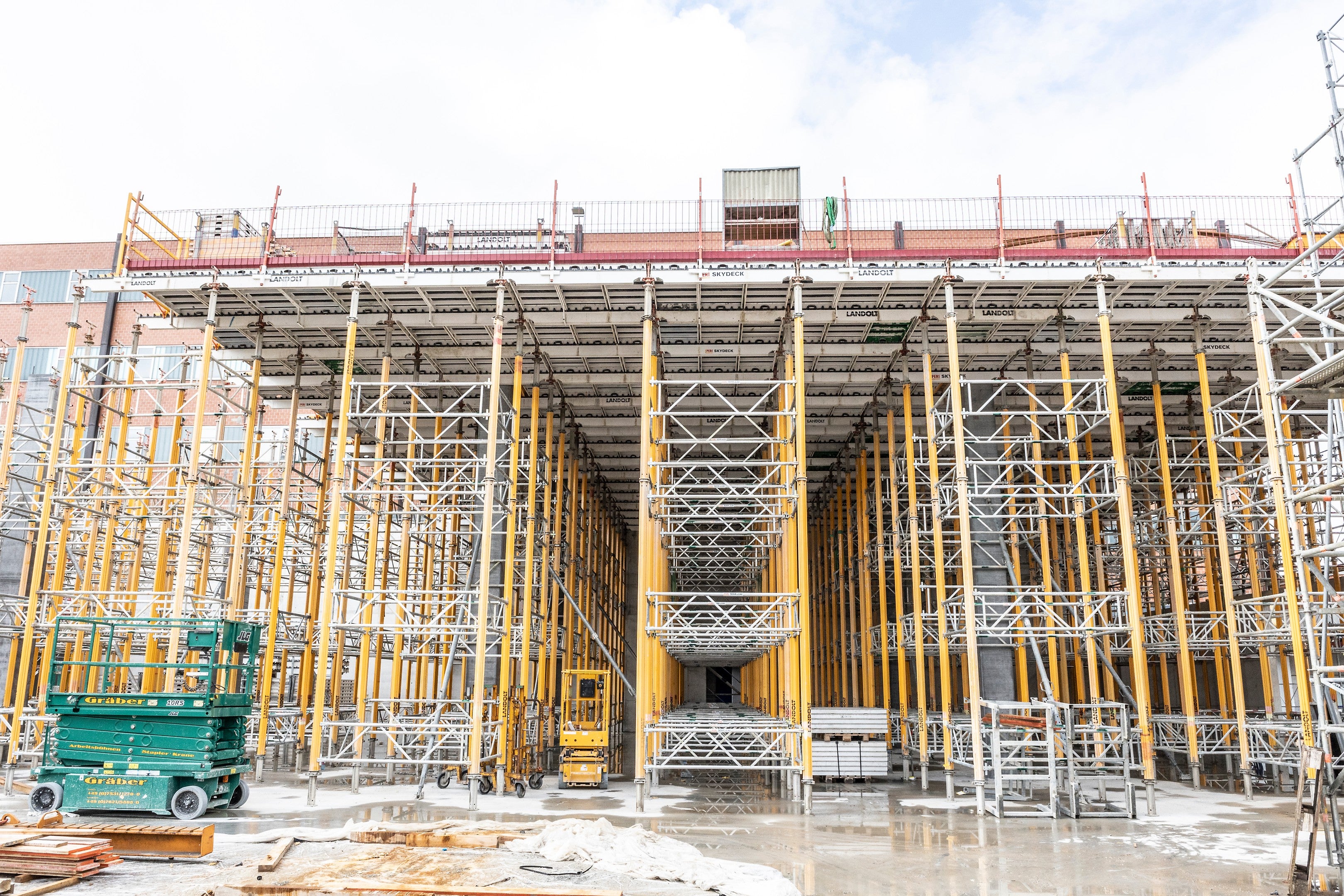 SKYDECK Paneel-Deckenschalung, MULTIPROP-Türme mit MRK-Rahmen, TRIO Wandschalung und Plattform MXP im Einsatz.