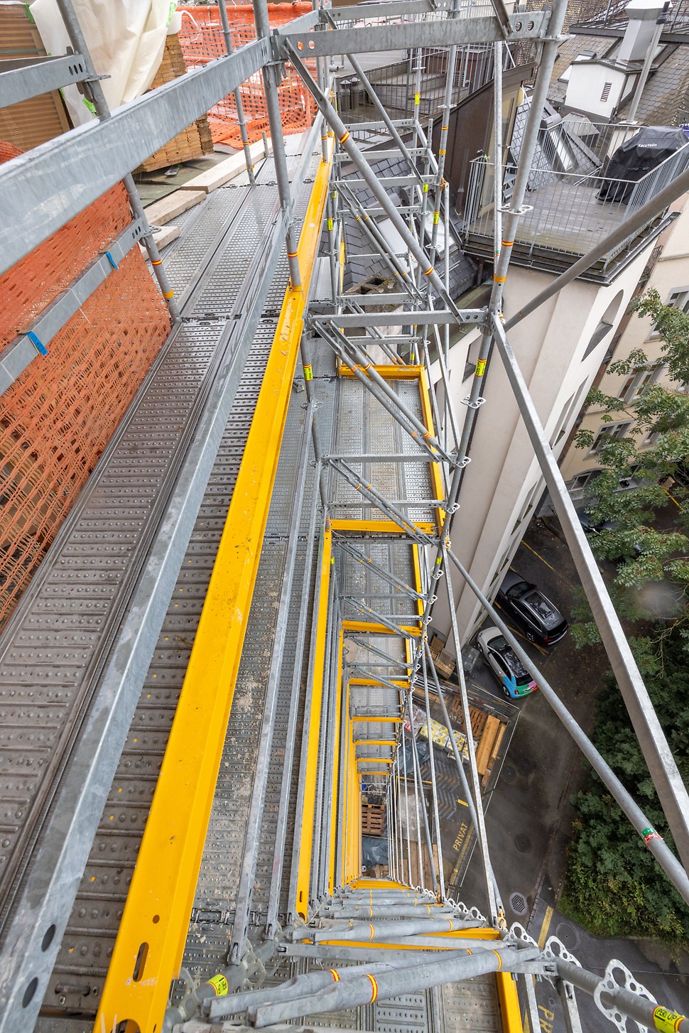 Die Geometrie des Gebäudes und das Fehlen von Ankern im oberen Teil des Gerüsts machten es hier erforderlich, das Gerüst in seiner Breite zu verdoppeln (0,67 m +1,00 m), um den äusseren Teil diagonalisieren zu können. Auch mussten die Diagonalen teilweise verdoppelt werden zur Erhöhung der Traglast.