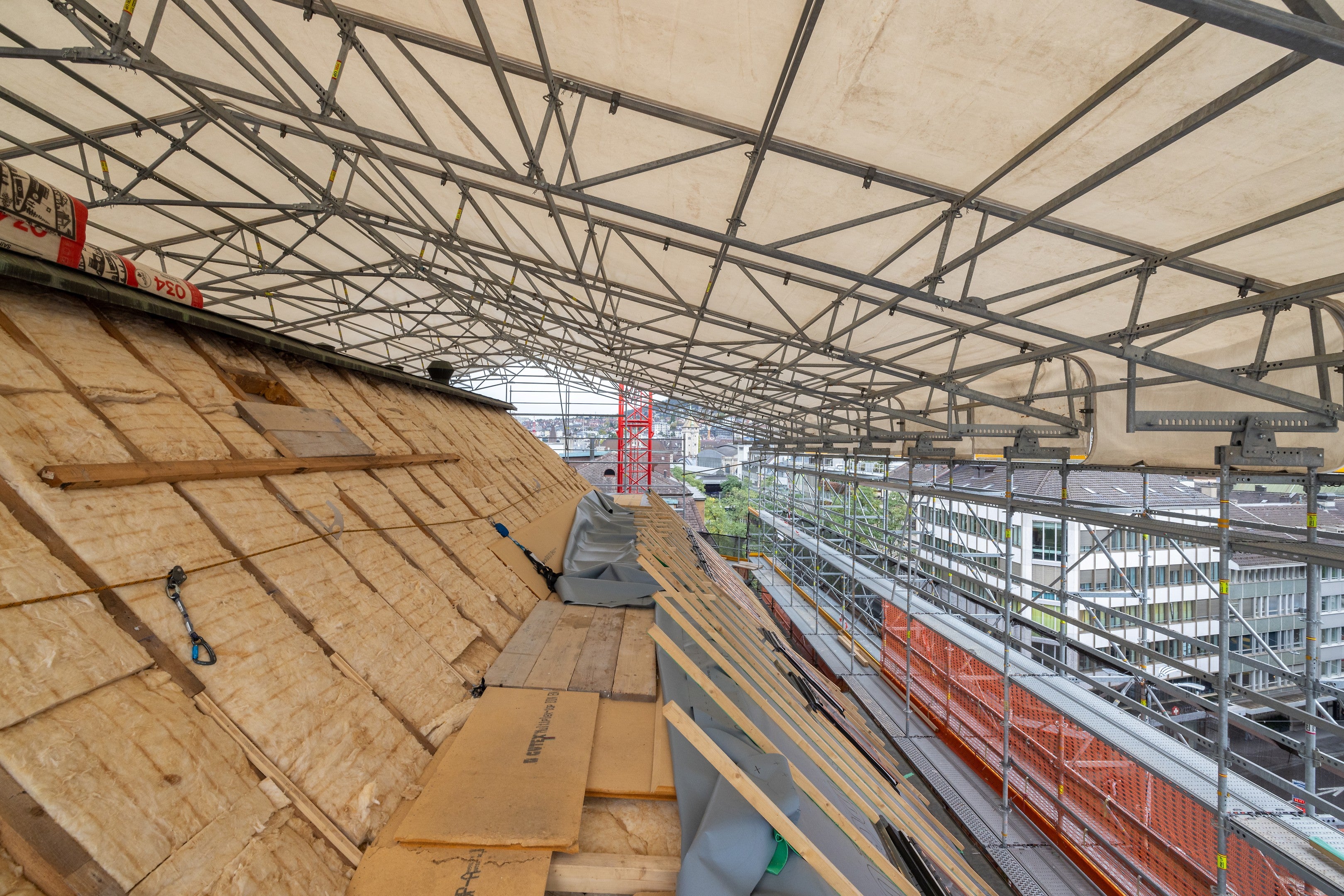 Generell bestand die Komplexität der Baustelle darin, dass das Dach auf einer Tragkonstruktion (Gerüst) ruht, die aus dem Dach herausragt und nicht oben verankert ist.