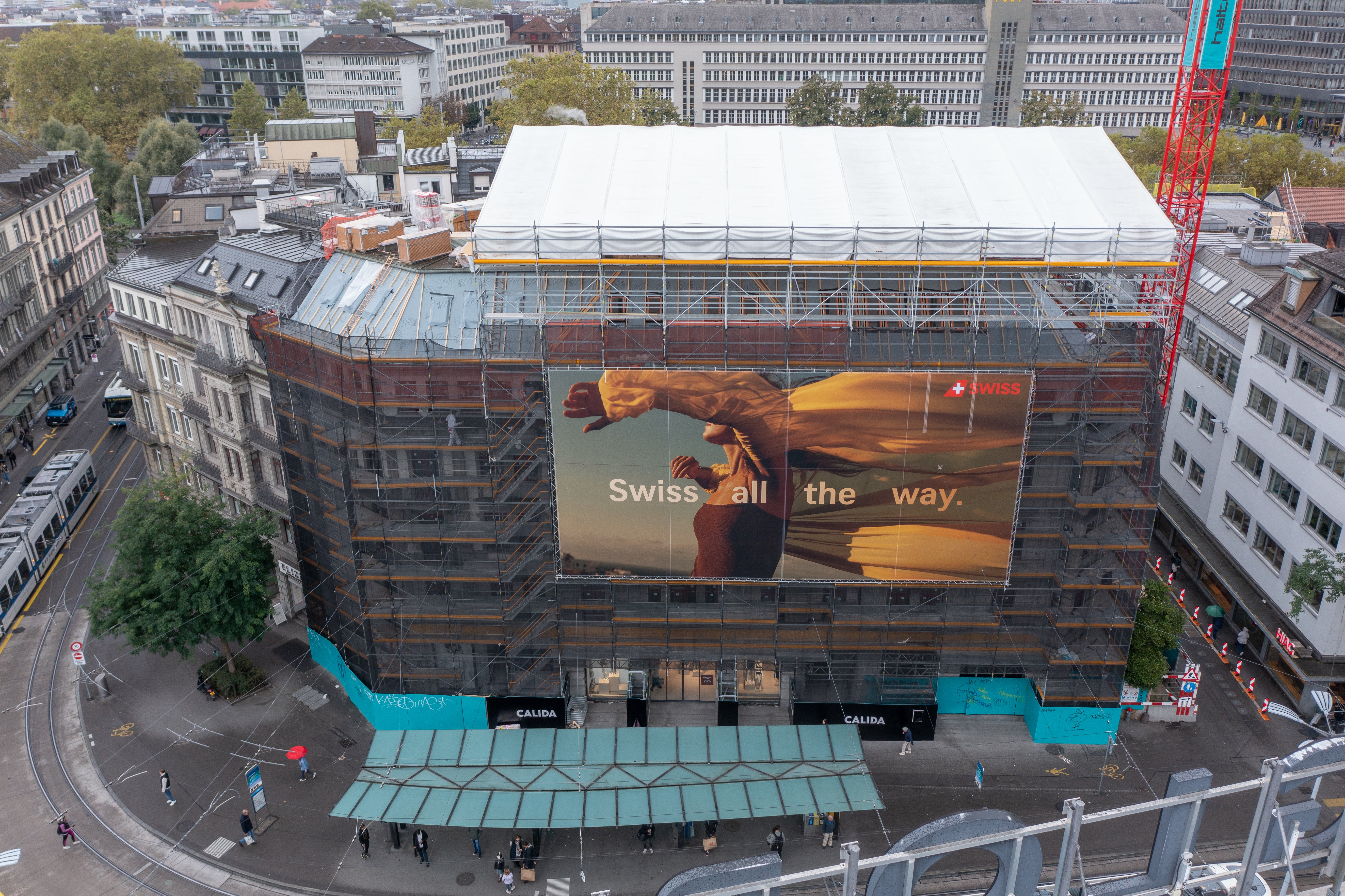 Schärer Blitzgerüst AG durfte das denkmalgeschützte Gebäude an der Löwenstrasse in Zürich mit ihrem PERI UP Gerüstbaukasten einrüsten, sprich einer Kombination aus dem Easy Stiel Fassadengerüst und Flex einrüsten. Ergänzend dazu kam das PERI UP Wetterschutzdach LGS 75 zum Einsatz.