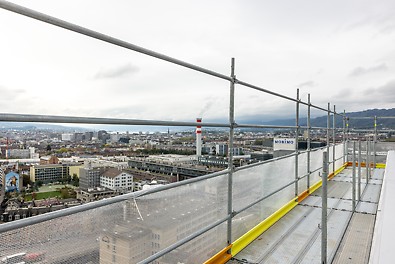 Die vorlaufende Geländermontage ohne PSAgA, spaltfreie Belagsebenen ohne Stolperkanten und die automatische Abhebesicherung der Beläge (Gravity Lock) sorgten für ein sicheres Arbeiten auf und um das Gerüst.