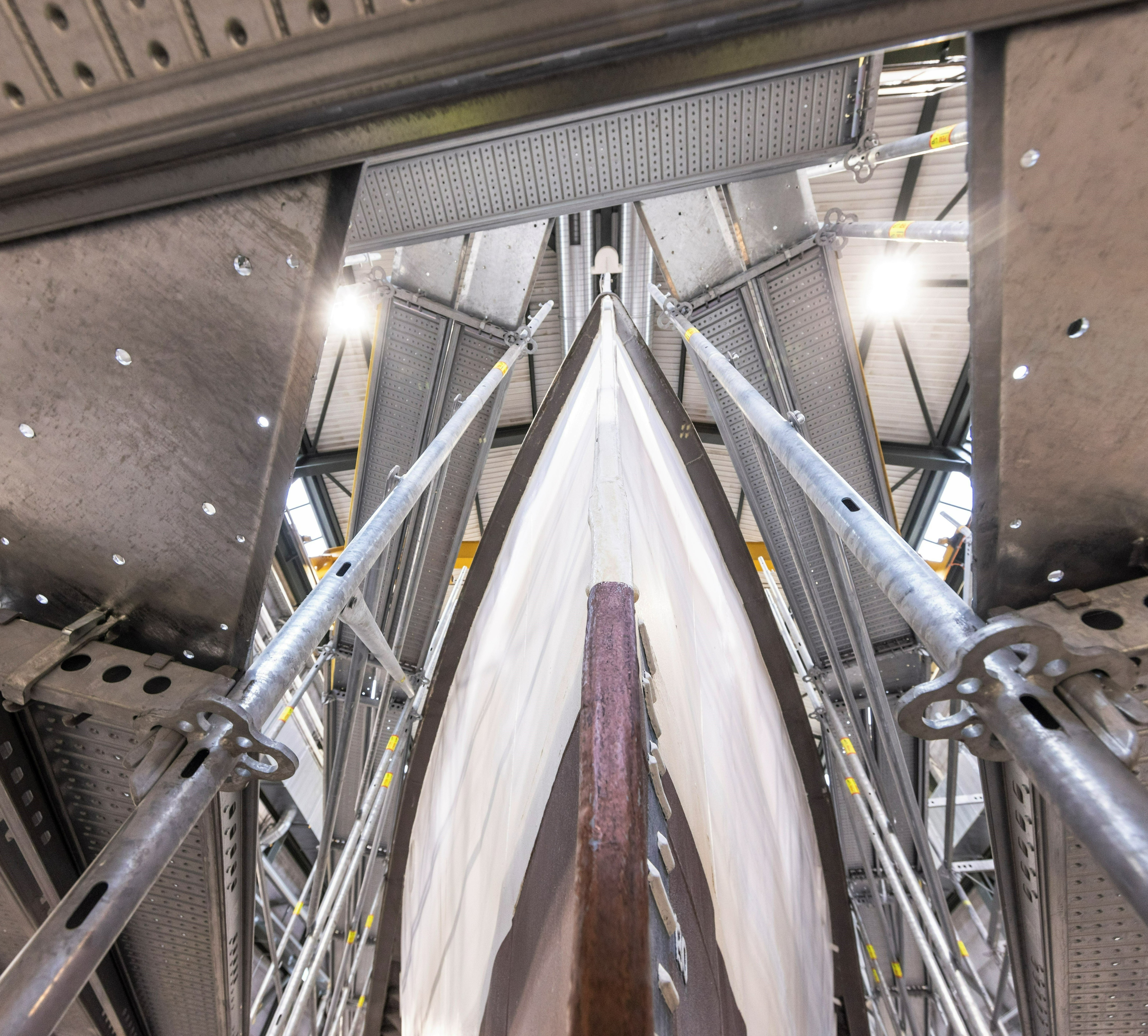 Mit der Stielvariante kann das 67cm breite Fassadengerüst, unter Einsatz des Ausgleichbelags EDL 33 mit Abhebesicherung auf dem Gerüstlauf, problemlos an die Schiffsrundung angepasst werden.