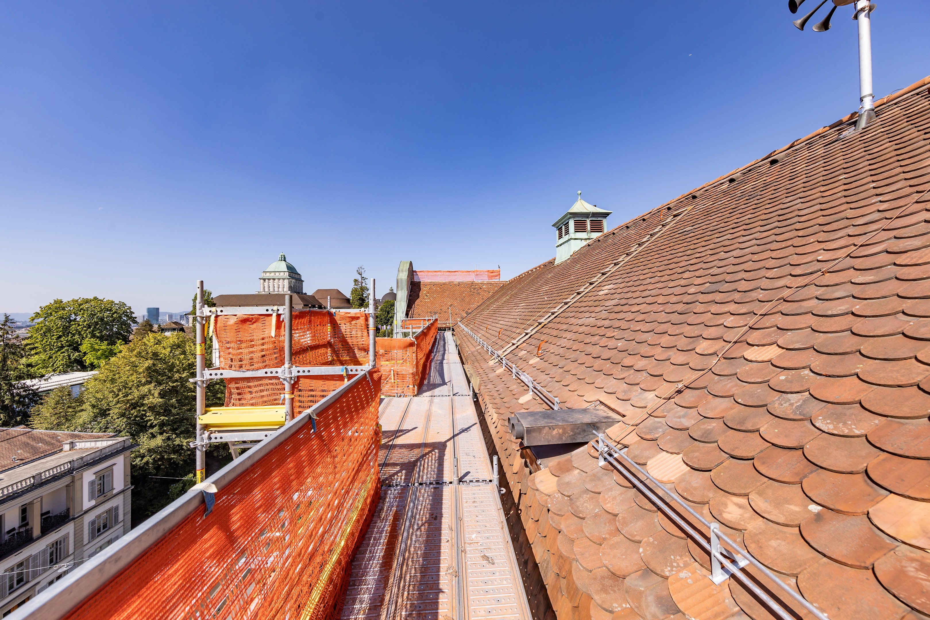 Dank der Kombination von den Systemen PERI UP Easy und PERI UP Flex konnte so sicheres Arbeiten auf dem Gerüst und dem Dach gewährleistet werden.