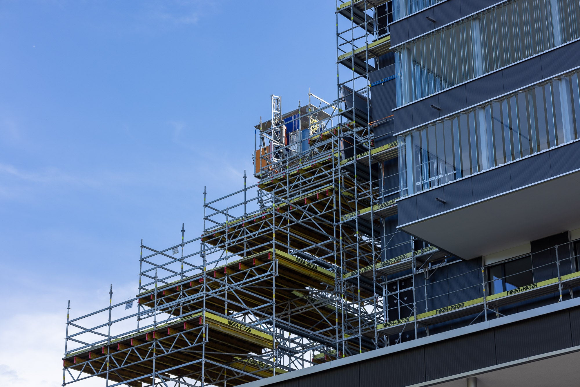 PERI UP Easy Stiel für die Fassade, PERI UP Flex und VARIOKIT für die Absetzpodeste (5kN/m²).