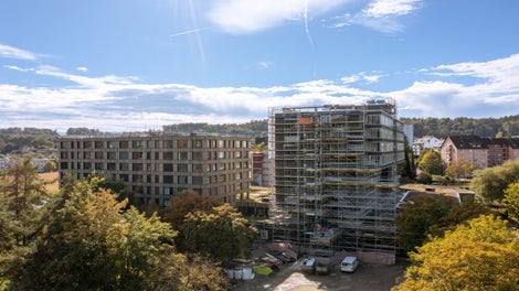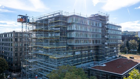 Im Zusammenwirken der unterschiedlichen Gerüstfunktionen kommen die Vorteile der miteinander kompatiblen Baukastensyteme VARIOKIT und PERI UP für den Gerüstbauer Meier+Ritter AG bei der Sanierung des St. Josephsheim in Bremgarten optimal zum Tragen.
