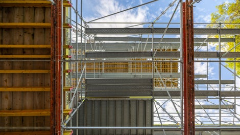 Kombination von PERI UP Flex und VARIOKIT für die Absetzpodeste (5kN/m²).