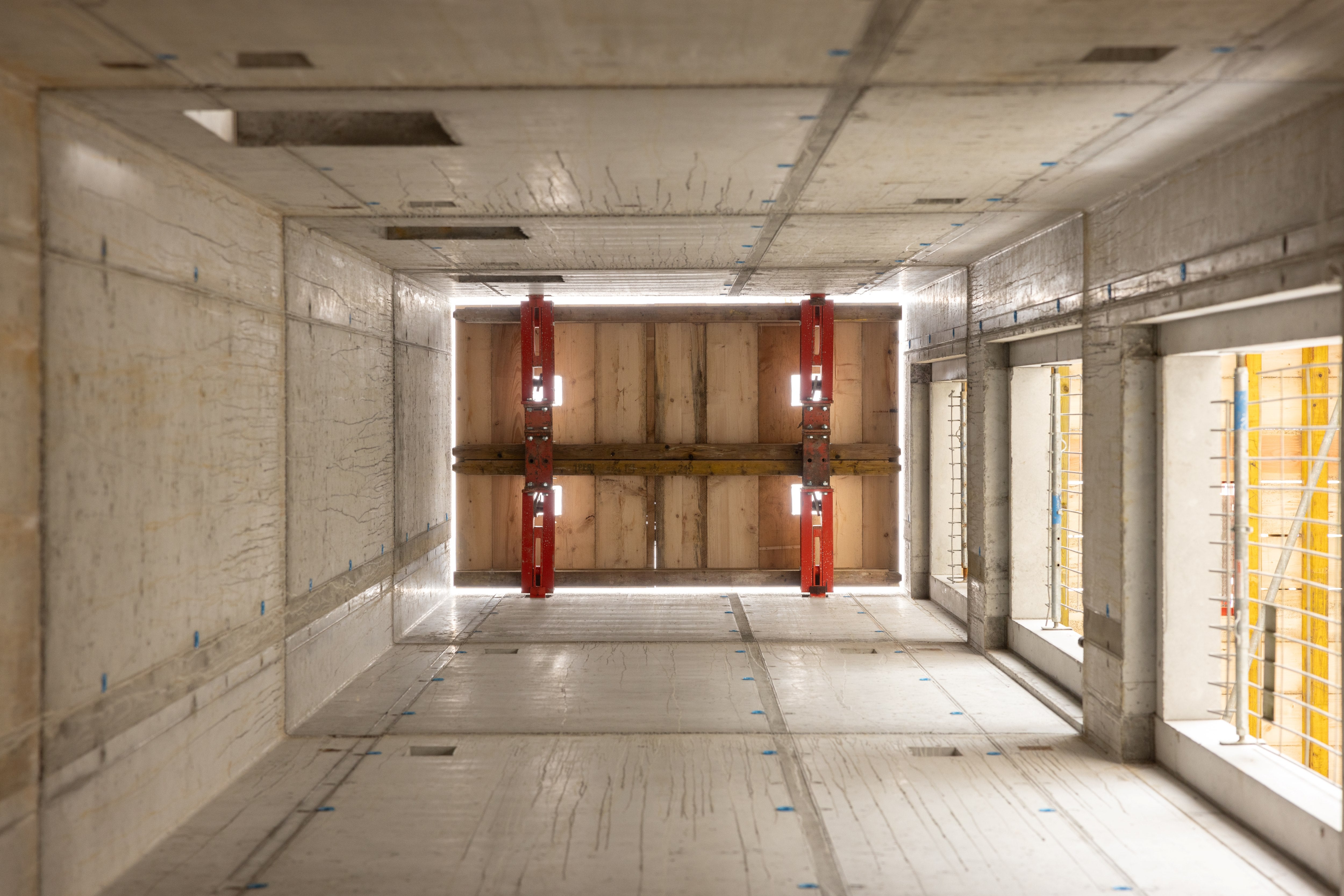 Mit der CB 240 Kletterschalung kann ein unabhängiger Baufortschritt der Treppenkerne Nord und Süd stattfinden. Es besteht keine Abhängigkeit oder Behinderung für den nachträglichen Einbau der Verbundecken.