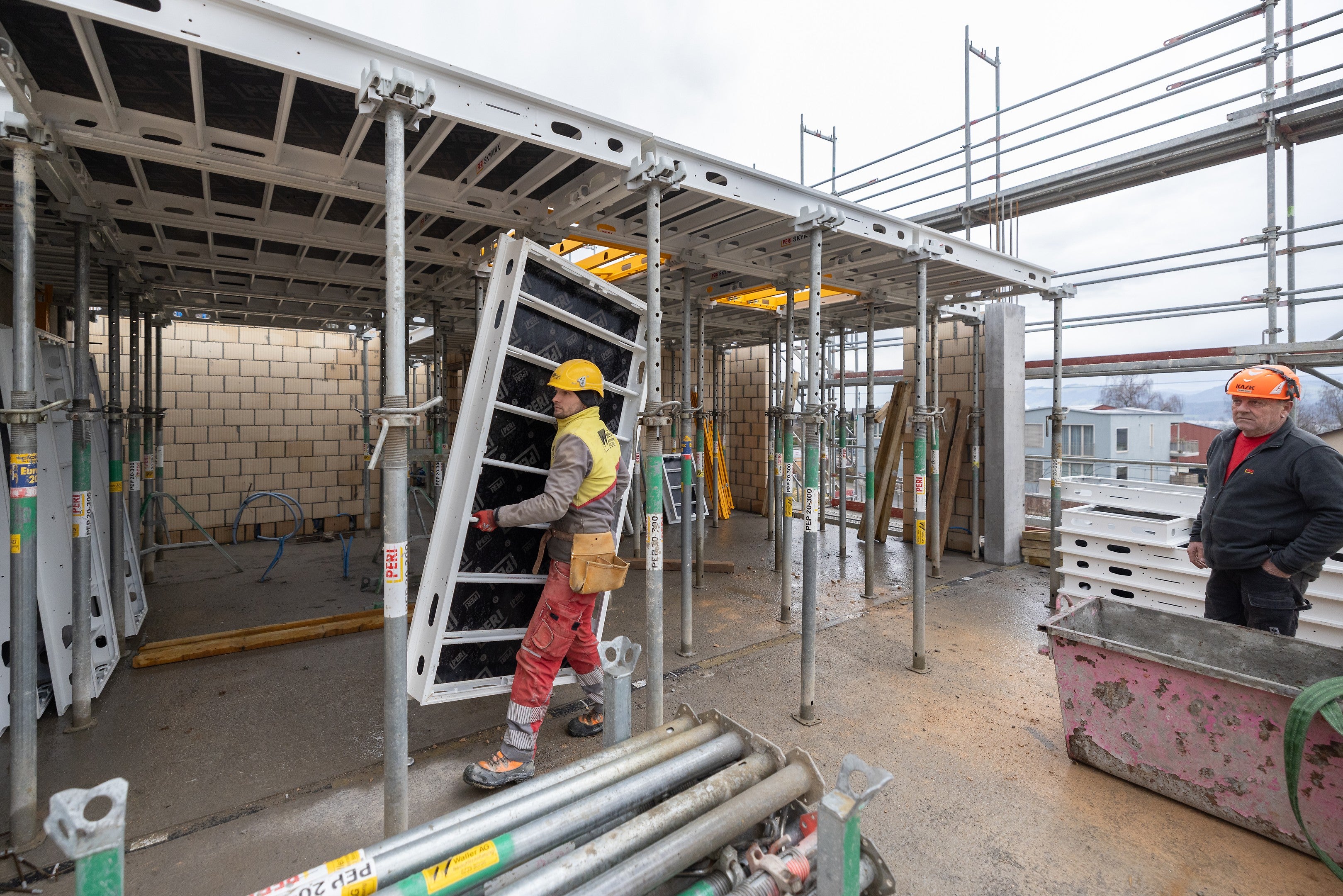 Die Waller AG Bauunternehmung setzt für die Erstellung einer Tiefgaragendecke eines MFH-Neubaus in Emmen auf die SKYMAX Grosspaneel-Deckenschalung geht somit einen weiteren Schritt in die Zukunft.
