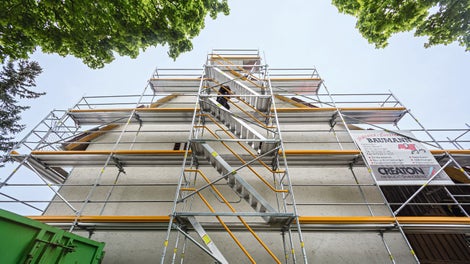 L’escalier d’une largeur de 67 cm s’adapte parfaitement à l’échafaudage de façade PERI UP.