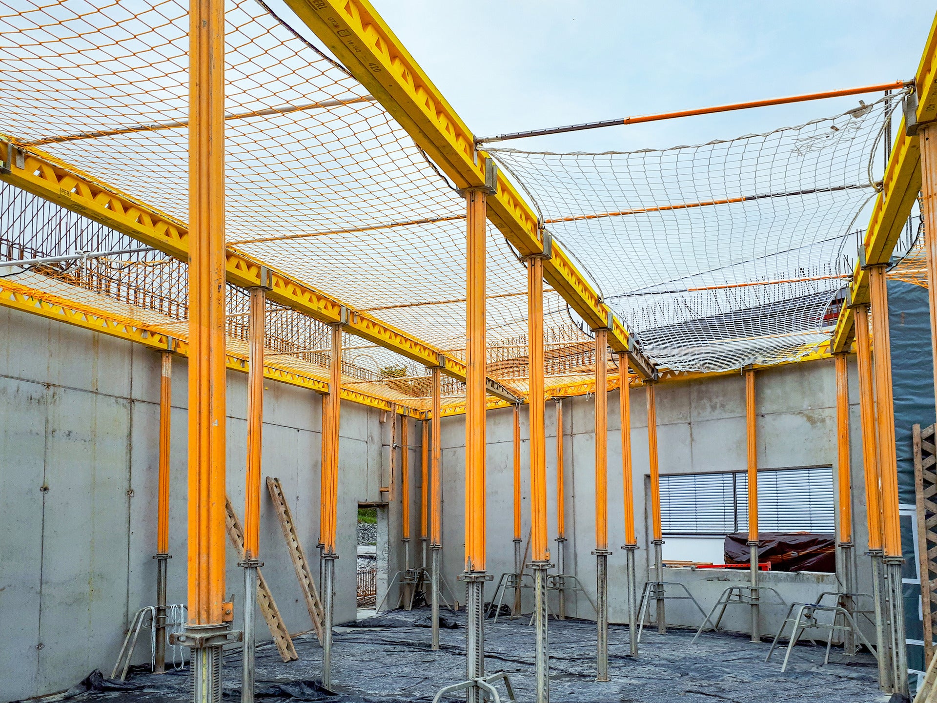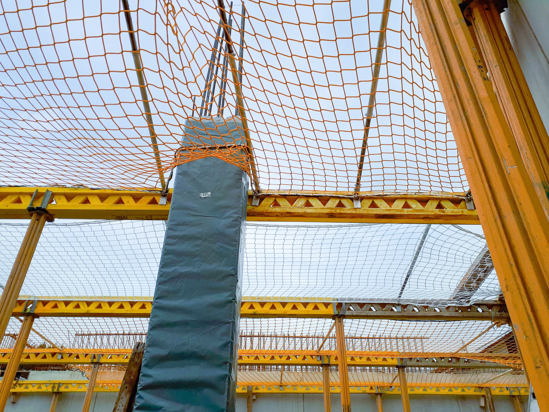Les filets de protection servent non seulement de protection contre les chutes, mais empêchent également les objets plus gros de tomber. Cela permet de protéger le personnel de chantier en hauteur et au sol dans la même mesure.