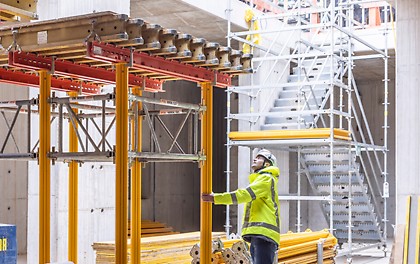 Efficiente.I tavoli sono già completamente assemblati alla consegna e possono quindi essere utilizzati immediatamente. Il montaggio della colonna è rapido e senza complicazioni. Le ampie superfici di cassaforma dei tavoli consentono una cassaforma rapida ed efficiente.