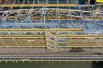 Zwischen den einzelnen Gerüstlagen wurde mit Stahlbelägen EDS 33x250 ein komplett spaltfreies Flächengerüst mit integrierte Abhebesicherung am Rechteckriegel UH-2 erstellt.