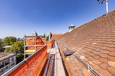 Dank der Kombination von den Systemen PERI UP Easy und PERI UP Flex konnte sicheres Arbeiten auf dem Gerüst und dem Dach gewährleistet werden.